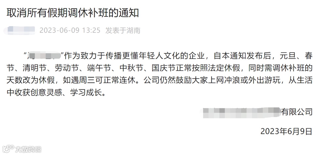 6月9日,湖南长沙一公司在社交账号上宣布取消所有假期调休补班,引发热议。