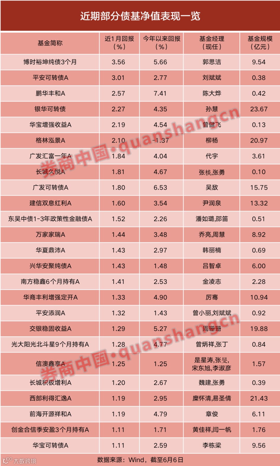 债券资产回升之下,债基净值也在持续收复失地。根据Wind数据,按照初始基金口径统计,截至6月5日近1个月来全市场共有近2900只债基实现正收益,博时基金旗下的博时裕坤纯债3个月近1个月期间净值累计上涨超3.5%,平安可转债A、鹏华丰和A、银华可转债、华宝增强收益A等基金净值涨幅均超过2%。