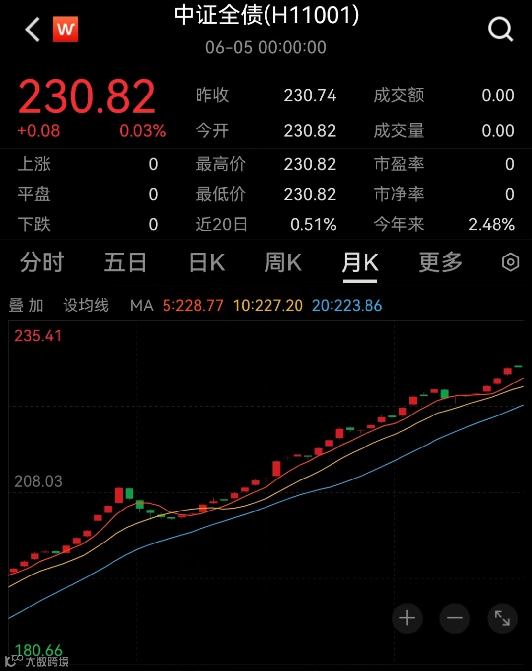 实际上从月度走势来看,中证全债指数在去年11月下跌0.88%后,就恢复了抬升态势,去年12月和今年1月均微涨0.16%,到今年5月单月涨幅已恢复到了0.8%。