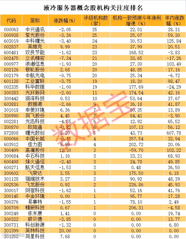 机构关注度方面,中兴通讯、紫光股份、中科曙光、英维克和双良节能位列前五,评级机构家数依次为35家、25家、24家、23家和23家。从成长性角度看,数据宝统计,中国长城、飞龙股份、精研科技等个股机构一致预测今年净利增速超过100%。