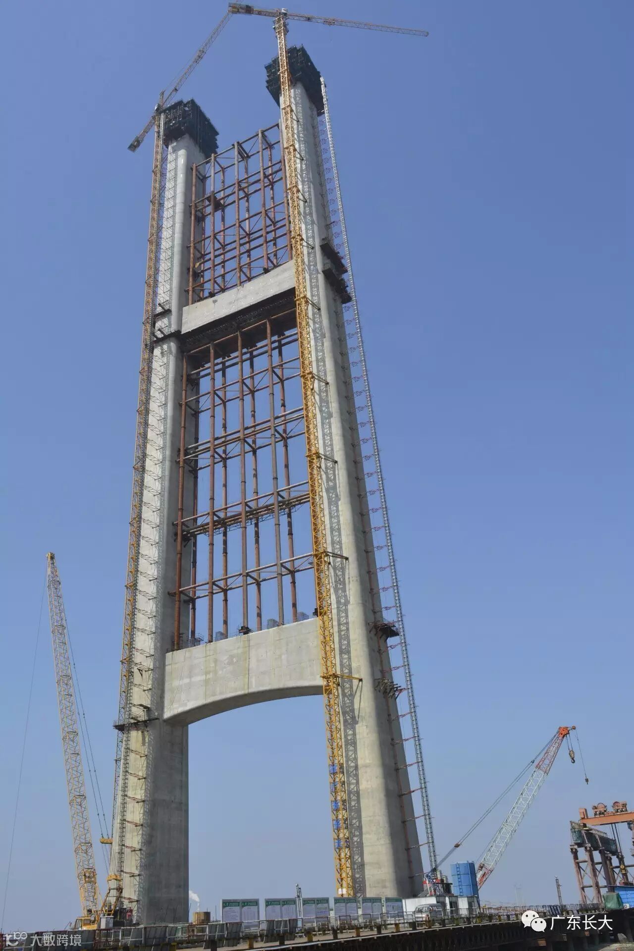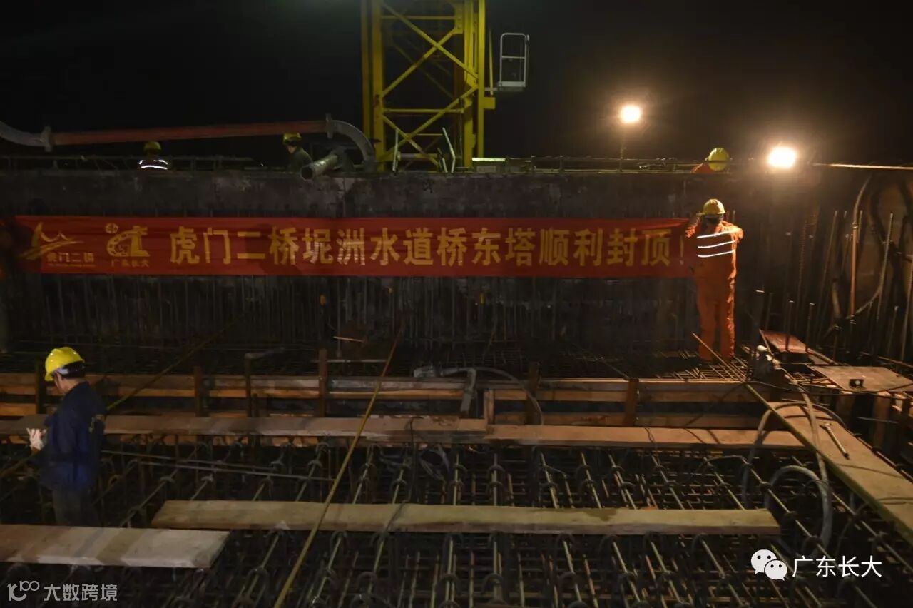 4月10日,广东省长大公路工程有限公司承建的虎门二桥坭洲水道桥东主塔顺利封顶。另一主塔——西主塔在1月23日已封顶。东西双塔相继封顶标志着虎门二桥坭洲水道桥正式从下部构造施工转入上部结构施工。