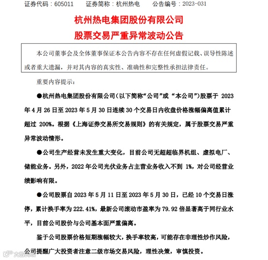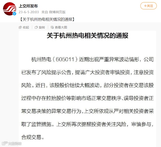 在这份情况通报中,上交所表示,杭州热电近期出现严重异常波动情形,公司已发布了风险提示公告,提请广大投资者审慎投资,注意投资风险。