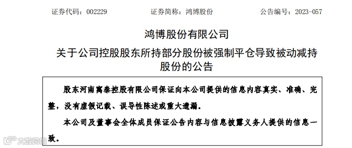 5月10日,鸿博股份发布公告透露控股股东寓泰控股及其一致行动人辉熠贸易所持4000万股、4094万股股份被司法冻结。因寓泰控股部分股份通过财通证券信用账户持有,在前述司法冻结后,财通证券收到法院协助执行通知书,随即宣布寓泰控股信用账户的融资融券合约于5月18日提前到期,并将在6月12日开始采取违约处置措施。