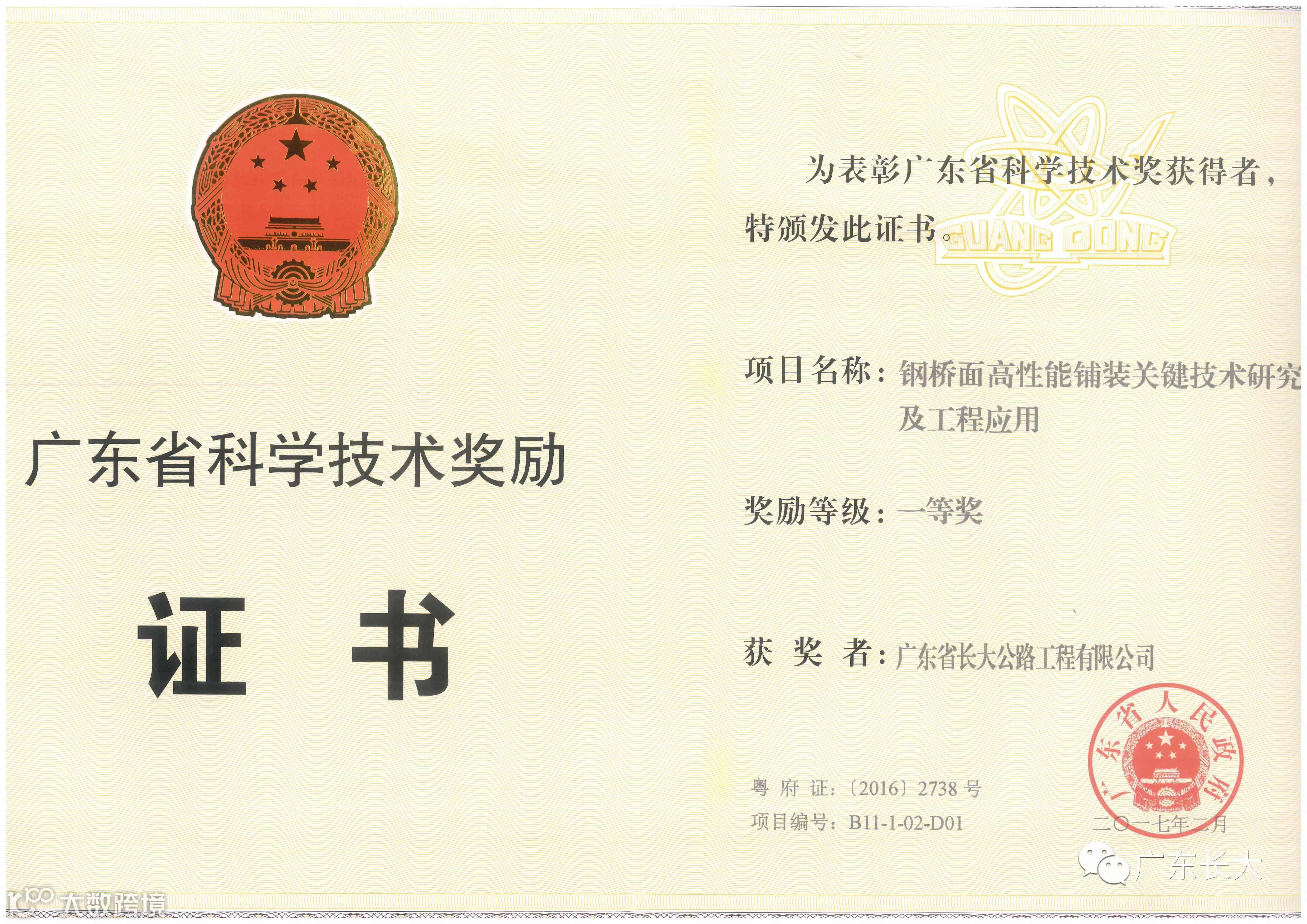 近期,广东省委、省政府召开全省创新发展大会,表彰获得2016年度广东省科学技术奖的先进单位和个人。其中,由广东省长大公路工程有限公司作为第一完成单位的项目《钢桥面高性能铺装关键技术研究及工程应用》荣获2016年度广东省科学技术奖一等奖。