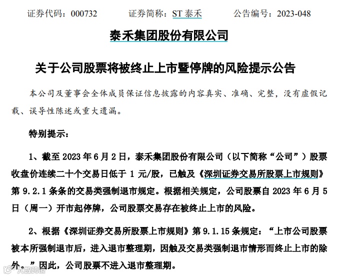 ST泰禾今日开盘一字跌停;盘后,公司发布公告称,截至2023年6月2日,泰禾集团股份有限公司股票收盘价连续二十个交易日低于1元/股,已触及《深圳证券交易所股票上市规则》第9.2.1条的交易类强制退市规定。公司股票自2023年6月5日(下周一)开市起停牌,公司股票交易存在被终止上市的风险。