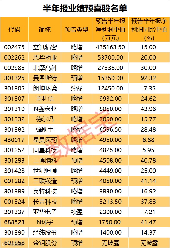 净利润增幅中值来看,曼恩斯特预计净利润增幅最高,公司上半年预计净利润中值为1.54亿元,同比增长92.32%;N鑫宏业、N环宇、三联锻造预计上半年净利润同比增幅中值均超40%。
