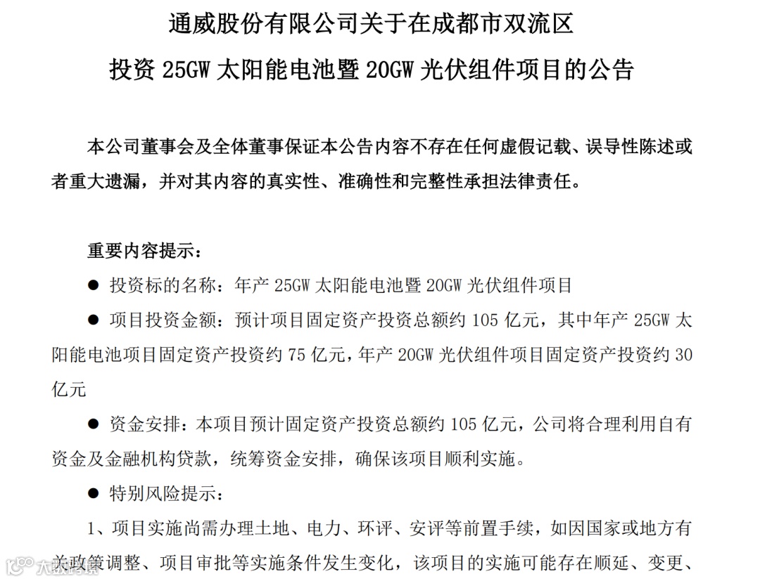 6月6日通威股份公告显示,全资子公司通威太阳能科技有限公司将在成都市双流区投资建设年产25GW太阳能电池暨20GW光伏组件项目,投资总额约105亿元。