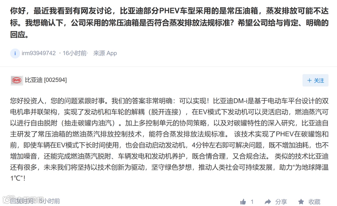 5月29日,比亚迪通过深交所互动易平台回复投资者提问,明确表示比亚迪PHEV车型采用常压油箱也可以达到国家排放标准。