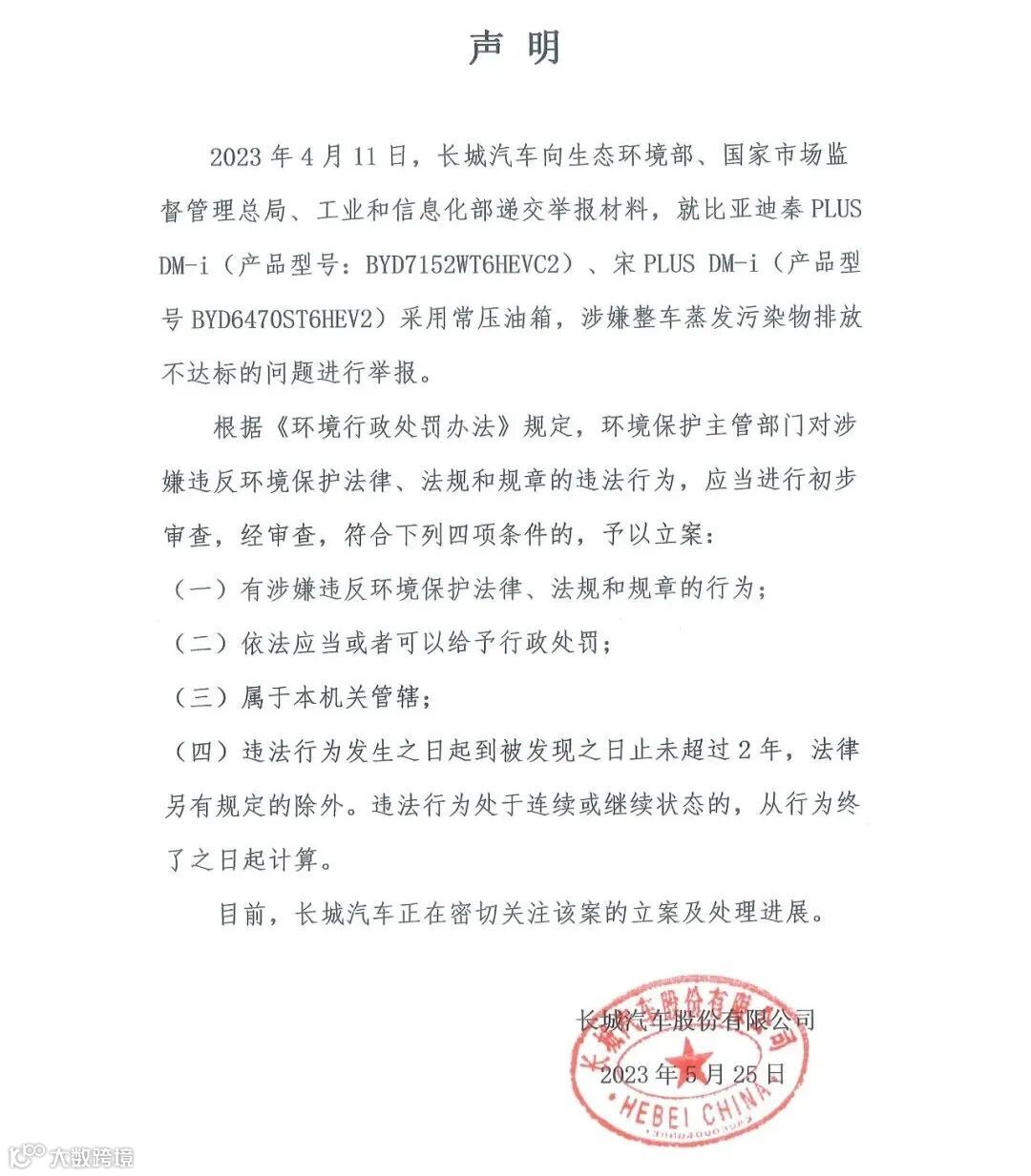 5月25日,长城汽车(601633.SH)发布声明称,公司向生态环境部、国家市场监督管理总局、工业和信息化部递交举报材料,就比亚迪秦PLUS DM-i、宋PLUS DM-i采用常压油箱,涉嫌整车蒸发污染物排放不达标的问题进行举报。