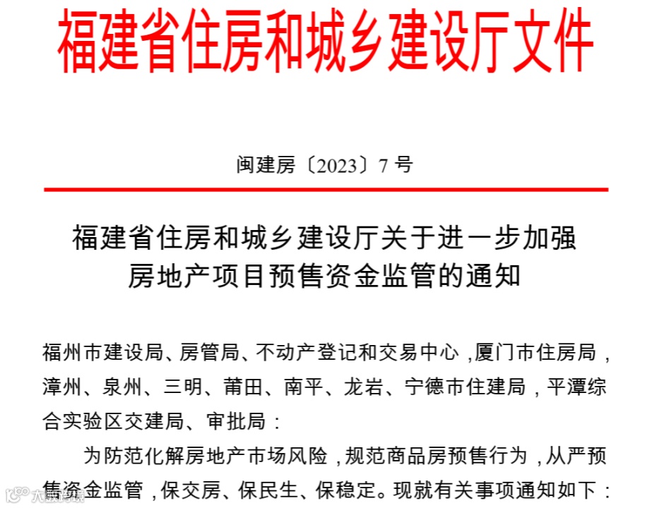 5月29日,福建省住建厅发布了《关于进一步加强房地产项目预售资金监管的通知》,出台了四方面措施,规范商品房预售行为,从严预售资金监管。
