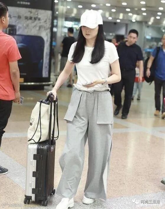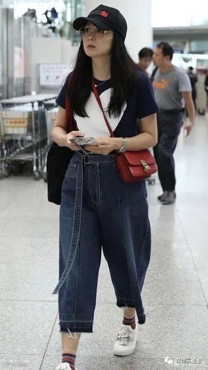当阔腿裤设计感强烈时,上身可以选择基础款衣物作为搭配,其中以白色T恤最为简约百搭,像王艳这样穿上白色短袖T恤,显得清爽减龄,既可以突显出白皙肌肤,又可以提亮一身造型,配上黑色漫画线条白色鸭舌帽,完全就是年轻小姐姐模样,丝毫看不出真实年龄。