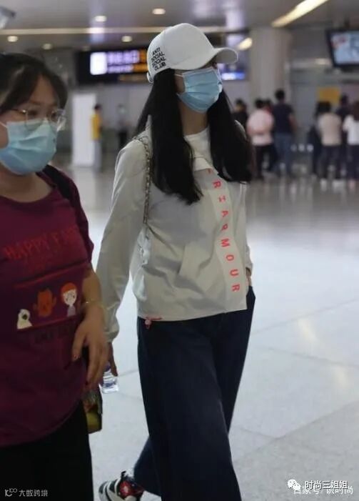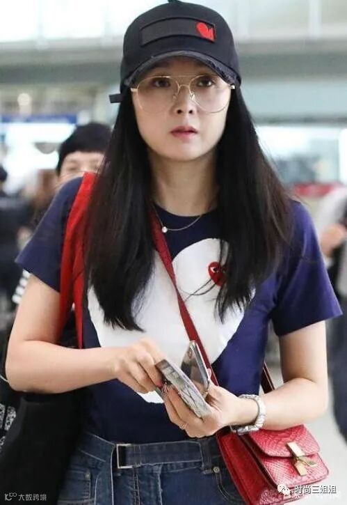 王艳以藏蓝色印花短袖T恤,搭配复古蓝牛仔阔腿裤,整体感觉休闲简约,充满时尚感和减龄感,柔顺披肩长发配上黑色鸭舌帽,显得低调随性,素颜状态下配上大框金丝眼镜,也是状态大好,一点不输年轻小花,陪着两个包包,走机场日常也是时尚亮眼。