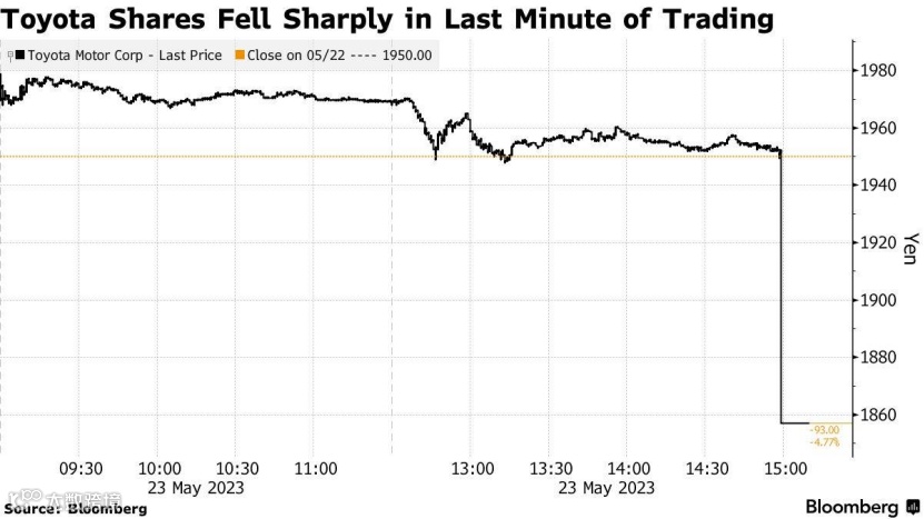 5月23日,日本股市临近收盘的最后一分钟,日本汽车巨头丰田汽车(TM.US)突然闪崩、暴跌,导致当日跌幅迅速扩大至4.8%,创2022年3月以来的单日最大跌幅,总市值单日蒸发15265亿日元(约合人民币777亿元),最新总市值为26.51万亿日元(约合人民币13500亿元)。