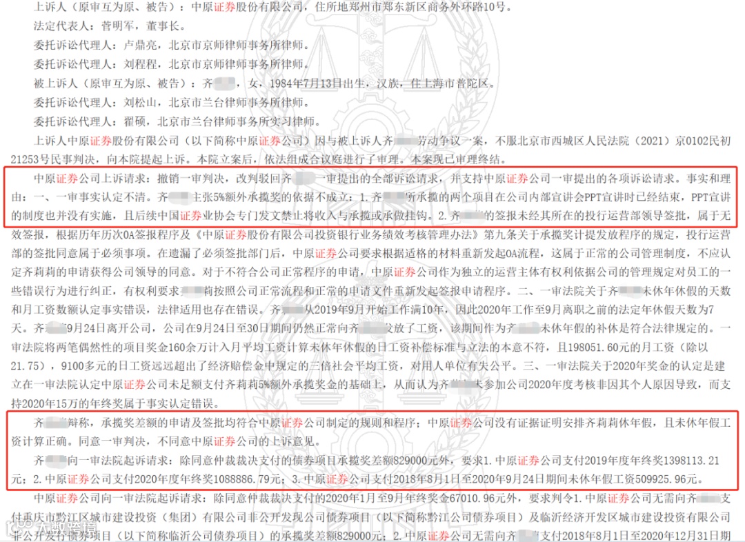 2021年5月12日,北京市西城区劳动人事争议仲裁委员会作出裁决,裁决:(1)中原证券支付齐某某2018年8月1日至2020年11月4日黔江公司债券项目及临沂公司债券项目承揽奖差额82.9万元;(2)中原证券支付齐某某2020年1月1日至2020年9月20日年终奖金6.7万元;(3)中原证券支付齐某某2018年8月1日至2020年12月31日期间未休年休假工资5.5万元;(4)驳回齐某某的其他仲裁请求。