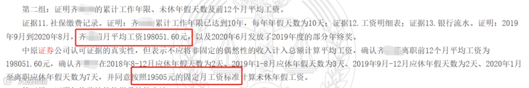 2020年9月24日,齐某某以中原证券公司未足额支付工资报酬为由提出了辞职。判决文书显示,齐某某固定月工资为1.95万元,加上部分当年发放的年终奖,齐某某离职前12个月月平均工资为19.8万元,即离职前一年薪酬约237万元。