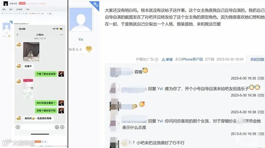 据上游新闻报道,日前,百度贴吧一篇名为《逆天女友穿婚纱去看演场会》的帖子引发众人关注。发帖人“YvI”5月30日14点发布了一系列聊天截图,并自称其女友准备穿着婚纱和闺蜜一起去看某明星的演唱会,聊天截图中有穿婚纱女生的照片以及疑似演唱会的照片。