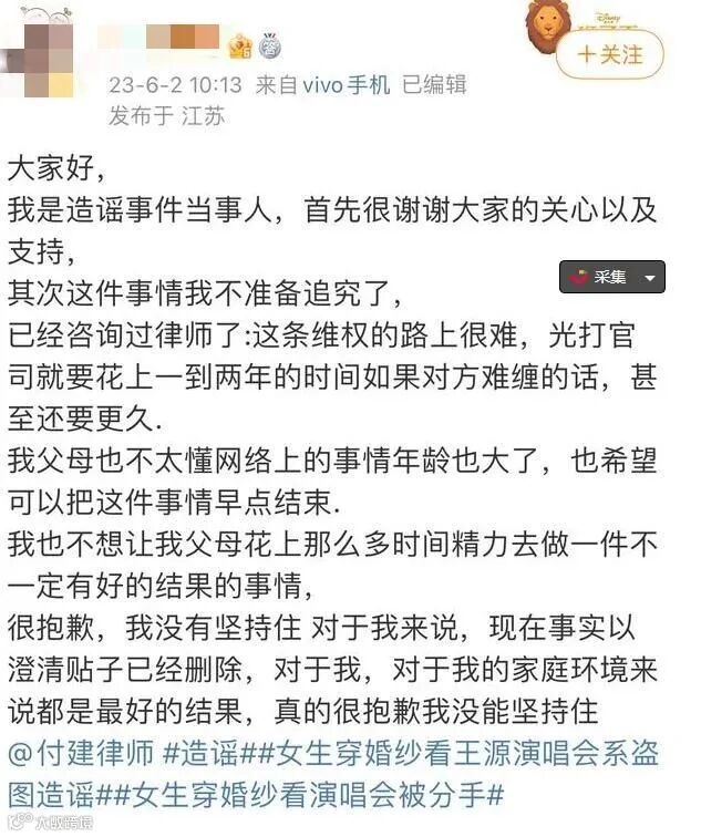 6月2日,当事人小美在微博上对此事作出回应,称已咨询律师,维权很难,不准备追究了,事情已澄清,帖子已经删除。对于自己的家庭环境来说,是最好的结果,很抱歉没能坚持住。