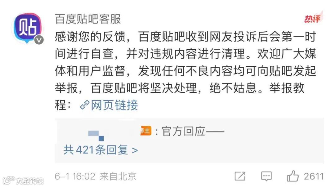 同日,@百度贴吧客服 在发博网友的评论区留言称:百度贴吧收到网友投诉后会第一时间进行自查,并对违规内容进行清理。