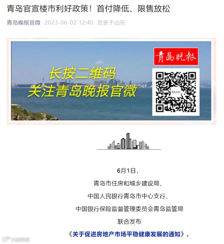 6月2日,青岛晚报官微发文称,青岛出台楼市利好政策,调整非限购区域购房首付比例,同时优化限售条件,支持刚需、改善需求。