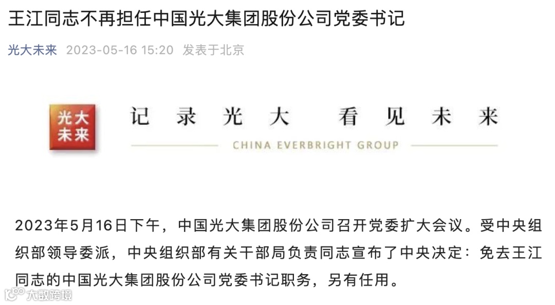 2023年5月16日,中国光大集团股份公司召开党委扩大会议。受中央组织部领导委派,中央组织部有关干部局负责同志宣布了中央决定:免去王江同志的中国光大集团股份公司党委书记职务,另有任用。