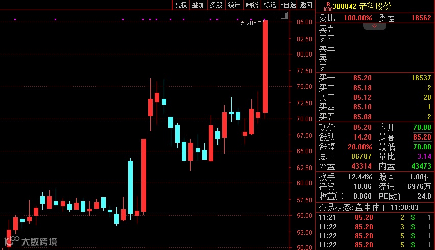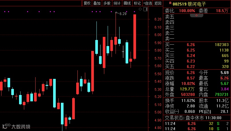 通信设备股早盘逆势走强,板块指数放量高开,盘中一度大涨近5%,银河电子盘中亦直线拉涨停,天孚通信触及20%涨停;细分光通信、5G概念等板块也纷纷表现活跃,金百泽20%一字涨停,杭电股份等涨停或涨超10%。