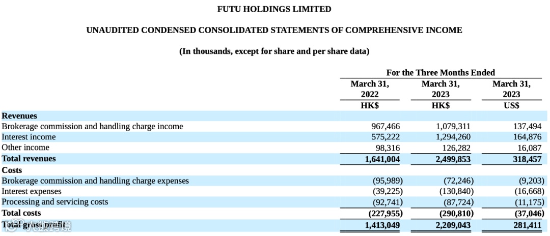 5月24日,富途控股公布2023年第一季度未经审计财报,一季度总营收25亿港元(约22.52亿元人民币),同比增长52.3%;非美国通用会计准则下(Non-GAAP)实现净利润12.68亿港元(约11.42亿元人民币),同比增长103.8%。