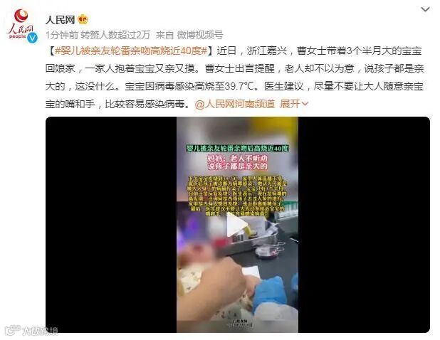 近日,浙江嘉兴,曹女士带着3个半月大的宝宝回娘家,一家人抱着宝宝又亲又摸。曹女士出言提醒,老人却不以为意,说孩子都是亲大的,这没什么。宝宝因病毒感染高烧至39.7℃。医生建议,尽量不要让大人随意亲宝宝的嘴和手,比较容易感染病毒。