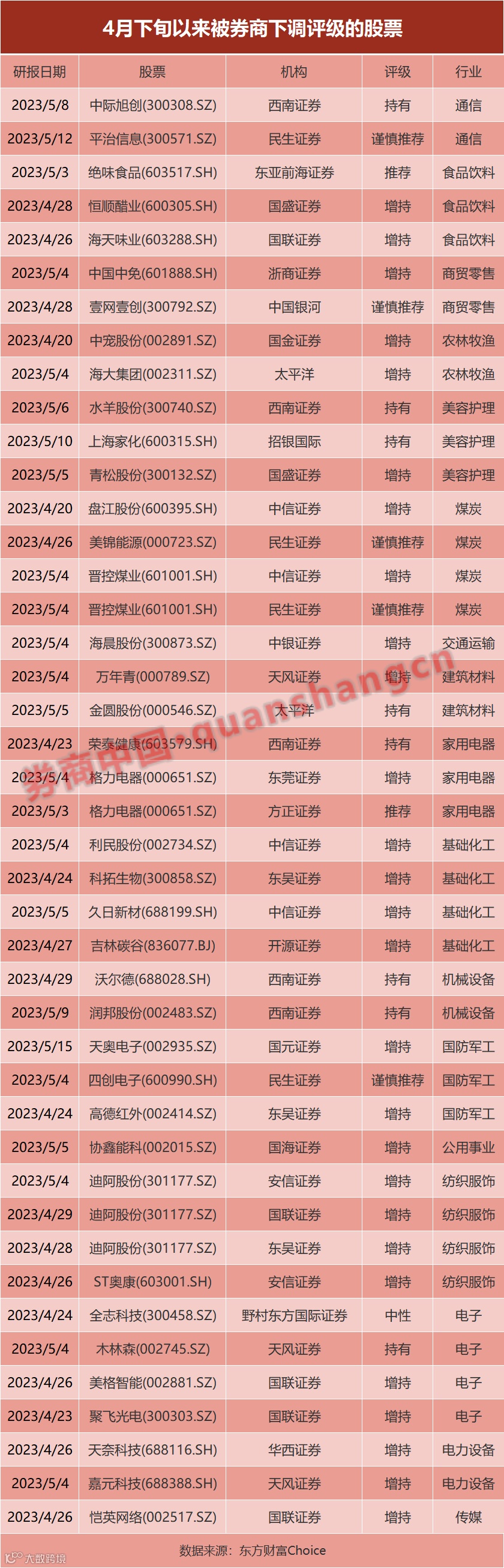 券商中国记者梳理发现,4月下旬以来,券商研报数量井喷,分析师们对39只股票的评级进行了下调,分布在电子、基础化工、煤炭、国防军工、美容护理等行业。