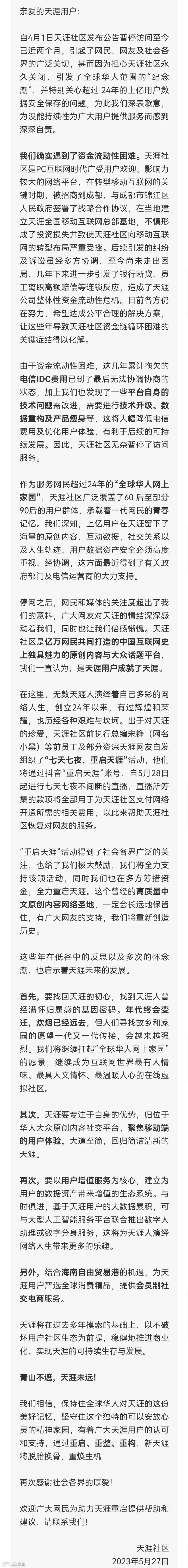 5月27日,天涯社区发布长文——《青山不遮,天涯未远──关于天涯社区近期暂停访问服务等情况公告》,回应了网站无法访问以及部分后续计划,并欢迎广大网民为助力天涯重启提供帮助和建议。