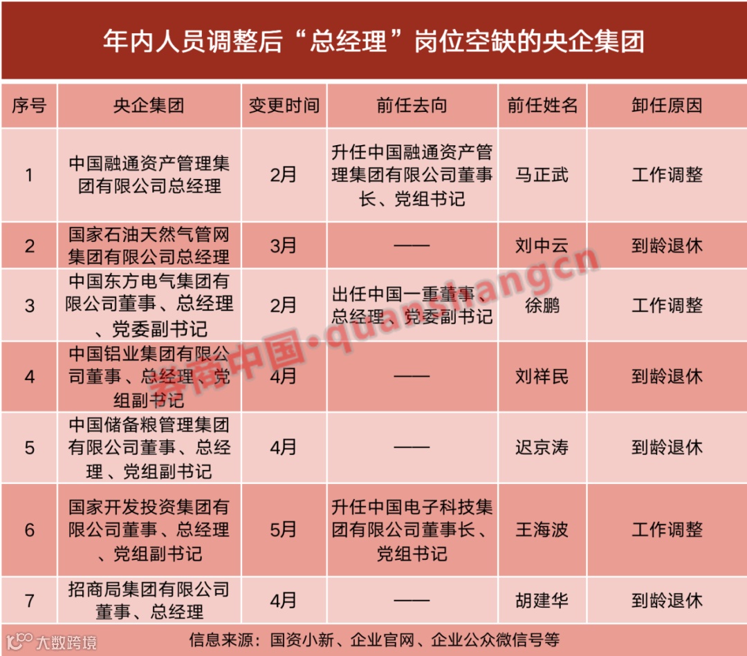 截至券商中国记者发稿,据公开消息,有十余家央企集团的主要领导岗位出现空缺。