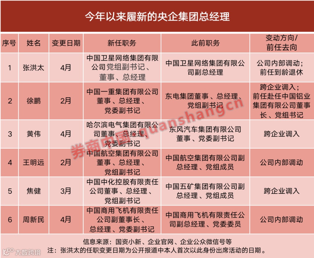 据券商中国记者不完全统计,今年以来发生领导人员变动的国资央企集团还包括:中国核工业集团有限公司、中国航天科工集团有限公司、中国航空工业集团有限公司、中国船舶集团有限公司、中国融通资产管理集团有限公司、国家石油天然气管网集团有限公司、国家电网有限公司、中国卫星网络集团有限公司、中国电子信息产业集团有限公司、中国第一汽车集团有限公司、东风汽车集团有限公司、中国一重集团有限公司、哈尔滨电气集团有限公司、中国铝业集团有限公司、中国航空集团有限公司、中国南方航空集团有限公司、中国中化控股有限责任公司、中国建筑集团有限公司、中国储备粮管理集团有限公司、国家开发投资集团有限公司、招商局集团有限公司等。