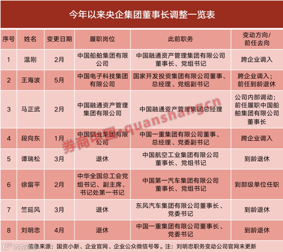 国资央企集团层面,年初以来,董事长一职发生变化的企业共有8家。截至目前,中国船舶集团、中国电科、中国融通集团、中铝集团等4家企业均迎来“新掌门”。