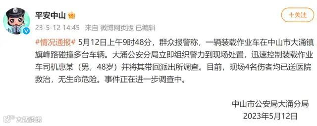 5月12日上午9时48分,群众报警称,一辆装载作业车在中山市大涌镇旗峰路碰撞多台车辆。大涌公安分局立即组织警力到现场处置,迅速控制装载作业车司机惠某(男,48岁)并将其带回派出所调查。目前,现场4名伤者均已送医院救治,无生命危险。事件正在进一步调查中。