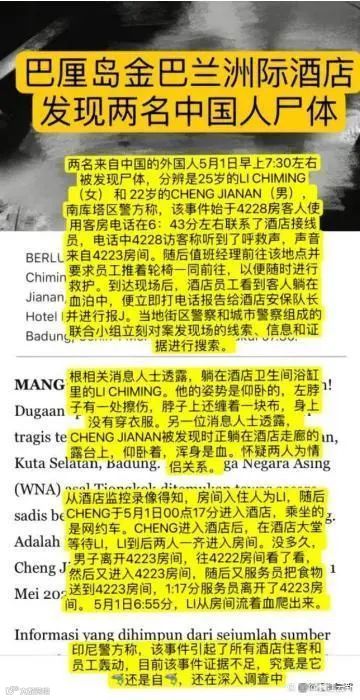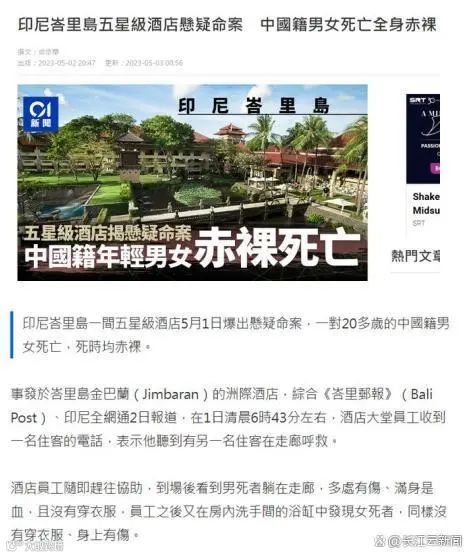 据多家当地媒体报道,5月1日,位于印尼巴厘岛的洲际酒店发生了一起惊悚的命案,两名中国游客不幸身亡。