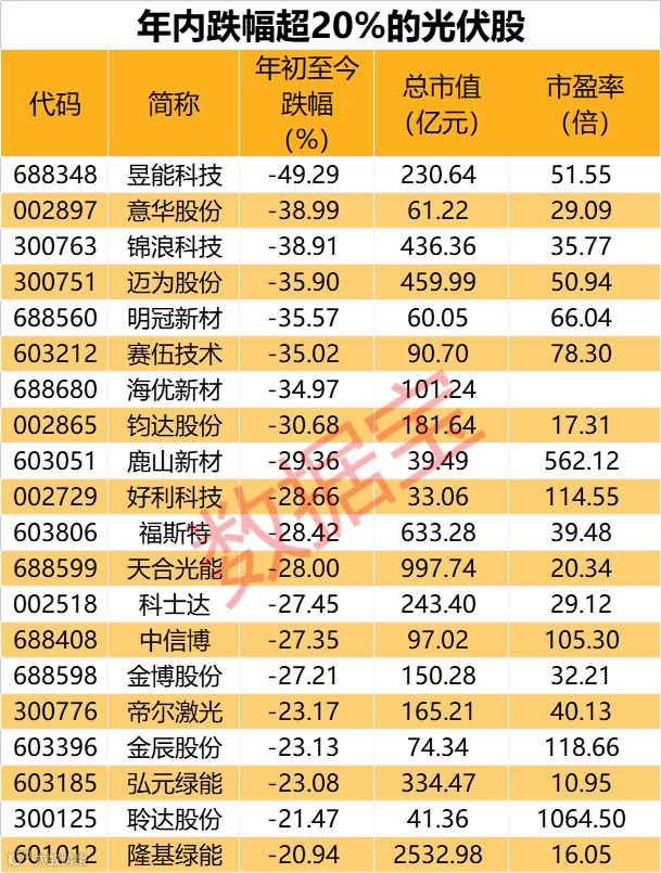 从股价上来看,自去年8月下旬以来,光伏股出现集体回调的情况,光伏指数较去年高点已累计下跌超过30%。今年以来光伏股价仍一蹶不振,20只光伏股最新价较年初下跌20%以上,昱能科技累计跌幅达到49.29%,是沪深两市除ST股外,唯一一只年内股价腰斩的个股。