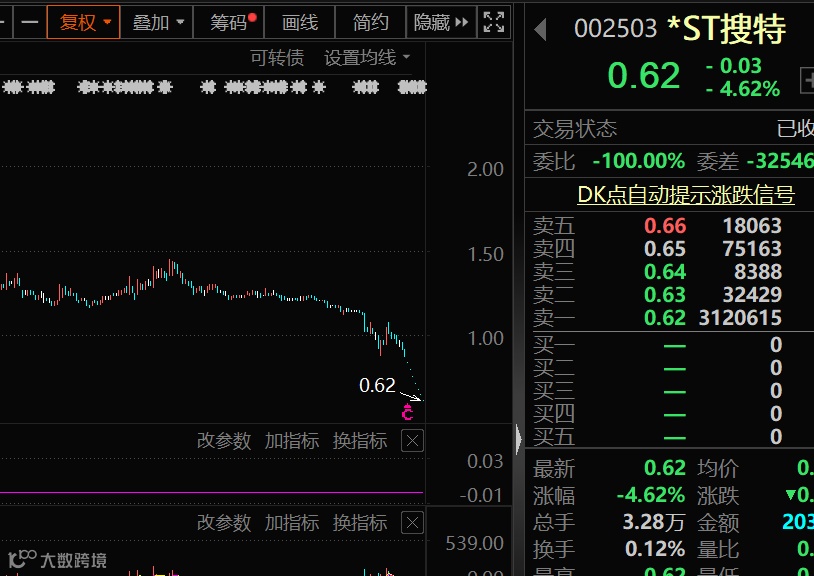 5月10日,*ST搜特再次一字跌停,逾300万手卖单封死跌停板,公司股票已连续七日跌停,最新股价0.62元/股,年内已累计下跌51.56%。