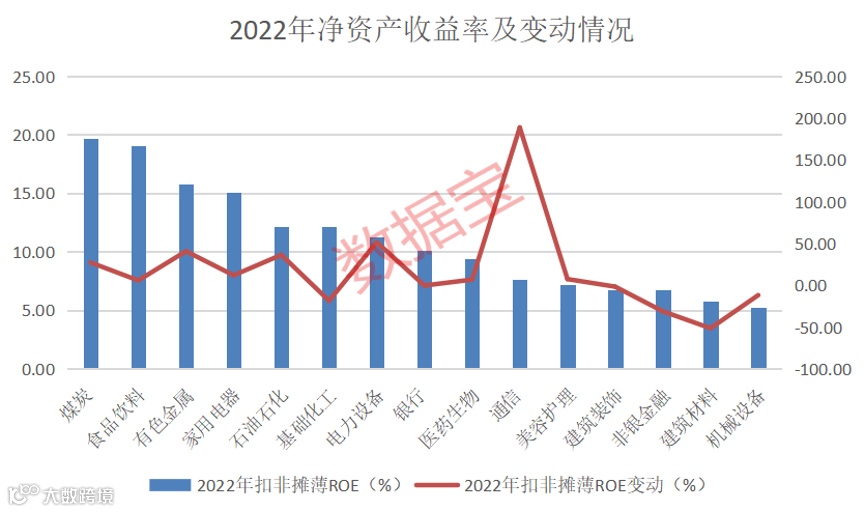 2022年A股整体总资产收益率为3.95%,较2021年略有上升。受煤炭、有色金属、电气设备、石油石化、通信的行业景气度上升等因素,A股资产运营效率大幅度提升。