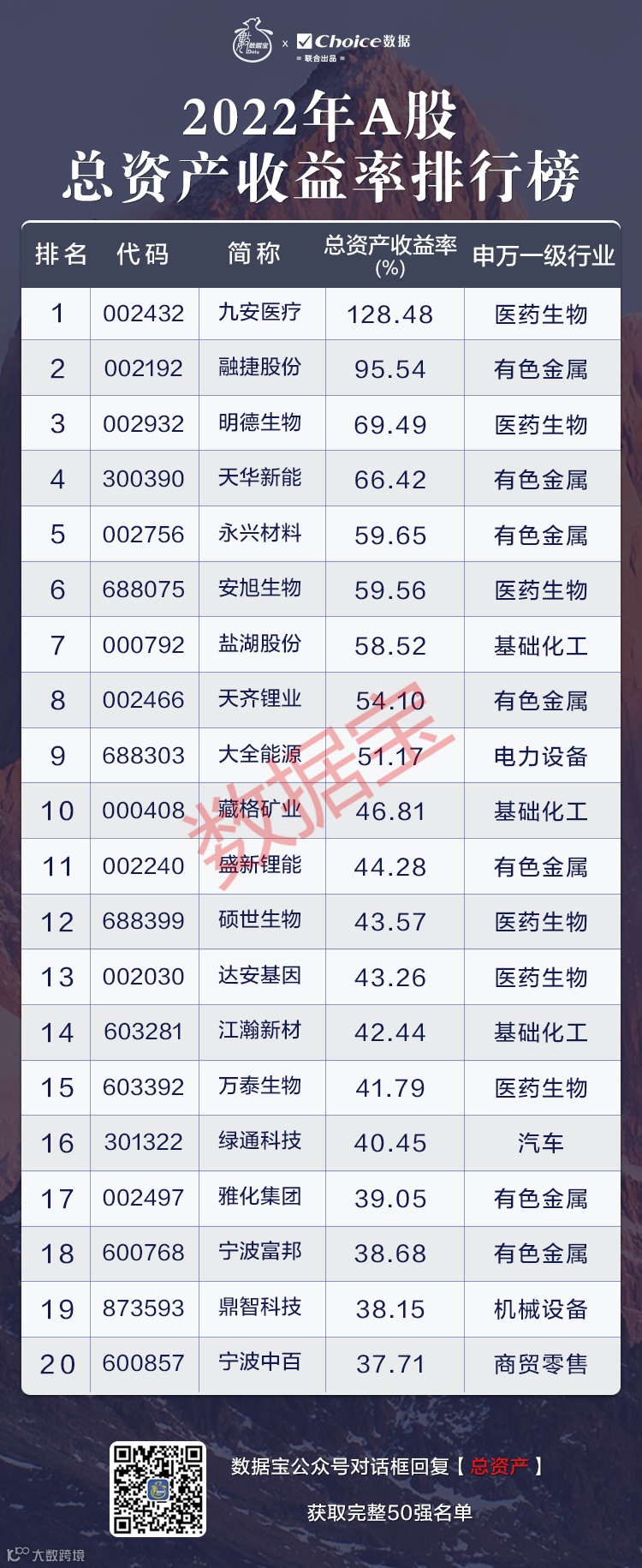 九安医疗、融捷股份、明德生物仍居于2022年总资产收益率排行榜的前三甲,与2022年A股净资产收益率排行榜排名保持一致。
