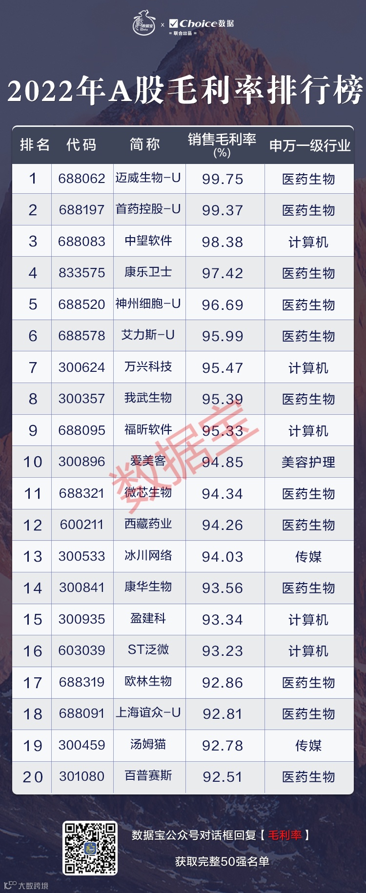 2022年毛利率排行榜50强中,过半的个股均属于医药生物行业,其次为计算机和传媒行业。