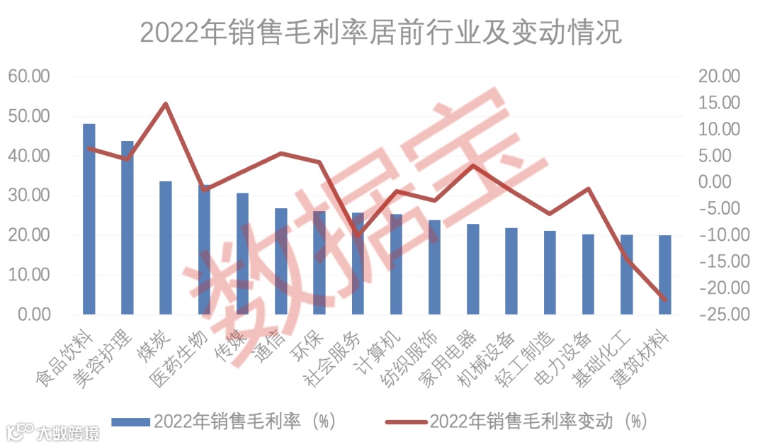 从申万一级行业来看,剔除金融行业(银行及非银行金融),食品饮料、美容护理、煤炭三大行业毛利率排名前三位。食品饮料行业毛利率最高,达到48.16%,较上年度提高6.44个百分点,再度蝉联行业榜首。