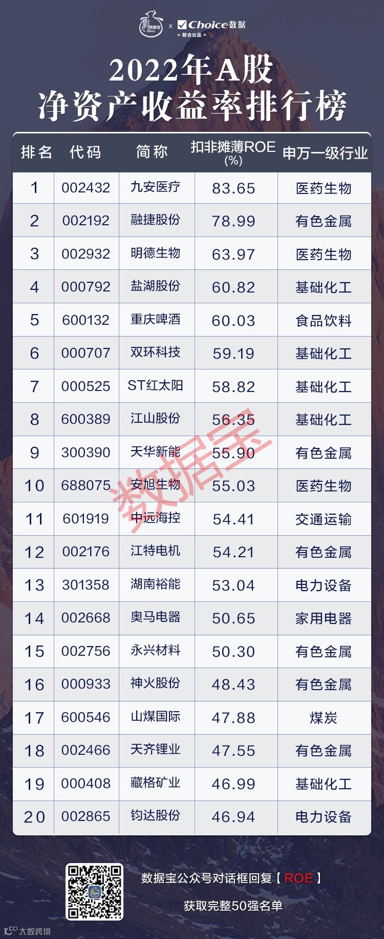 2022年A股净资产收益率排行榜前50,扣非摊薄ROE前三甲的依次是九安医疗、融捷股份、明德生物,其中九安医疗、融捷股份为首次上榜。明德生物2021年排名16位,2022年再度入围,扣非摊薄ROE为63.97%,跃居第三。