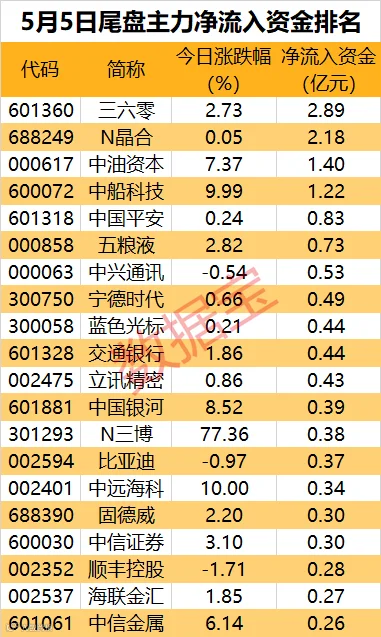从个股看,有16股尾盘净流入资金超3000万元。三六零、N晶合、中油资本、中船科技尾盘获主力抢筹超1亿元。
