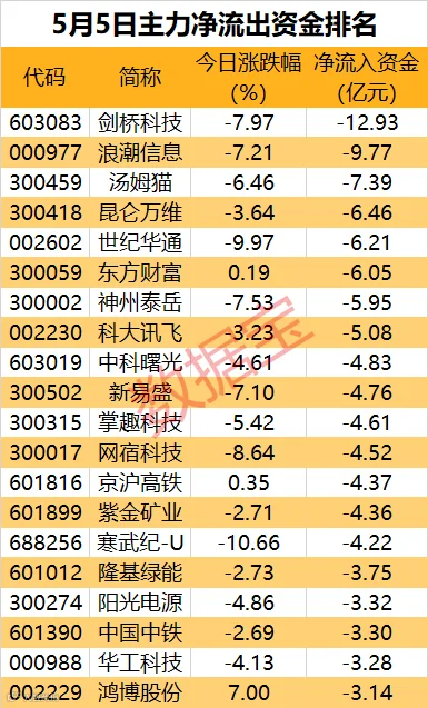 数据宝统计,20股遭主力资金净流出超3亿元,多只电子、计算机股遭到主力抛售。剑桥科技主力资金净流出12.93亿元,居首位。其后,净流出金额居前的个股为浪潮信息、汤姆猫、昆仑万维和世纪华通等,净流出均超6亿元。