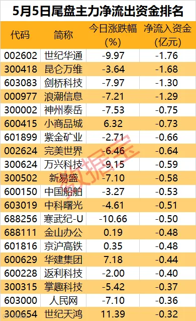 数据宝统计,信息技术板块个股世纪华通、昆仑万维、剑桥科技、浪潮信息尾盘均遭主力出逃1亿元居前。神州泰岳、小商品城、紫金矿业、完美世界均遭主力净卖出超6000万元。