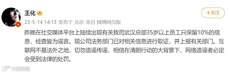 14日,小米的一则新闻引发关注。针对“小米武汉总部35岁以上员工只保留10%”的传闻,小米集团公关部总经理王化当日下午发布声明称,此消息为谣言。