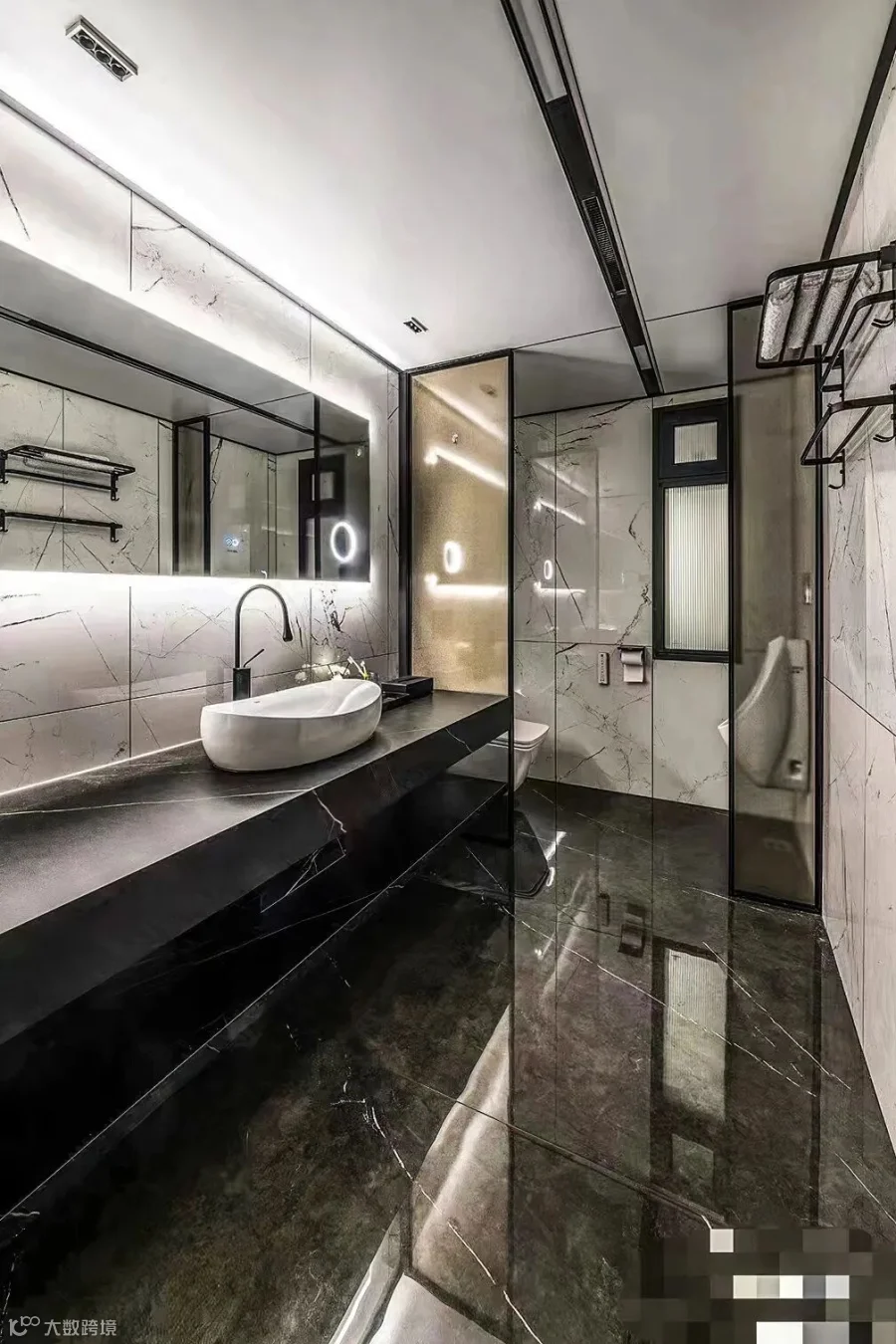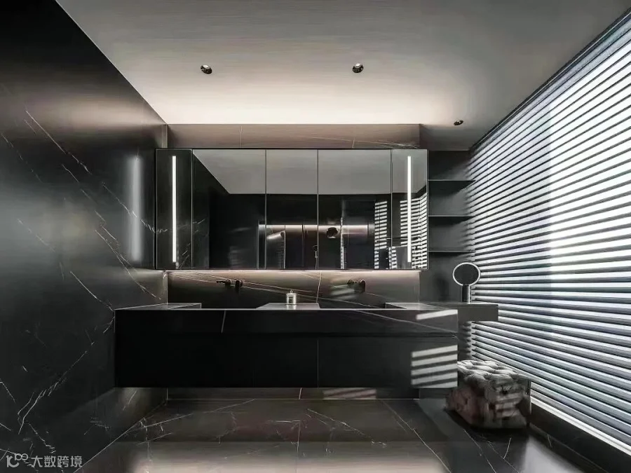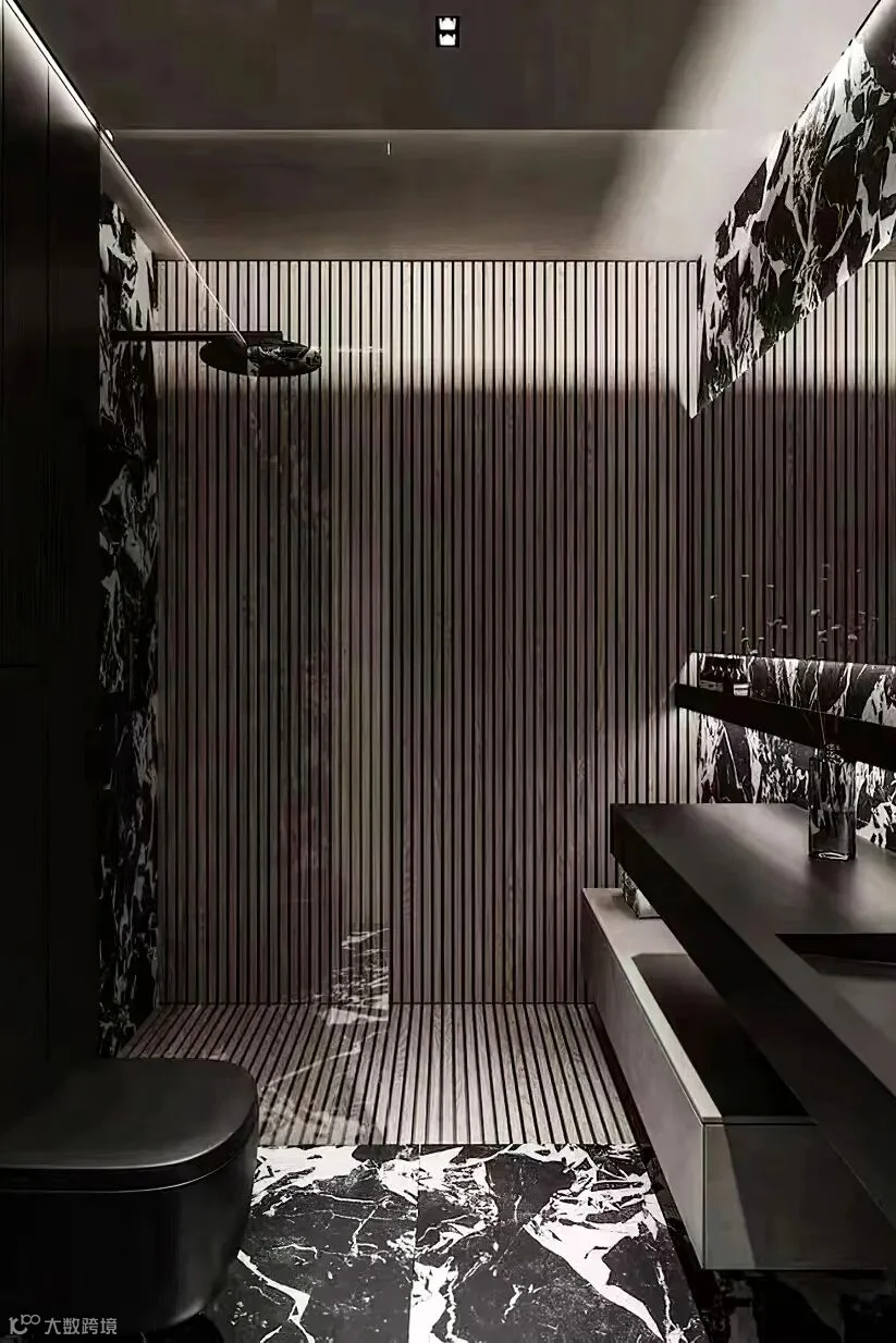 拿破仑黑在空间应用中真是非常百搭。户主在卫浴间运用拿破仑黑作为背景墙面,或作为装潢点缀,与不同板块的材质互为映衬,又相互协调,瞬间提升了空间的高级感。