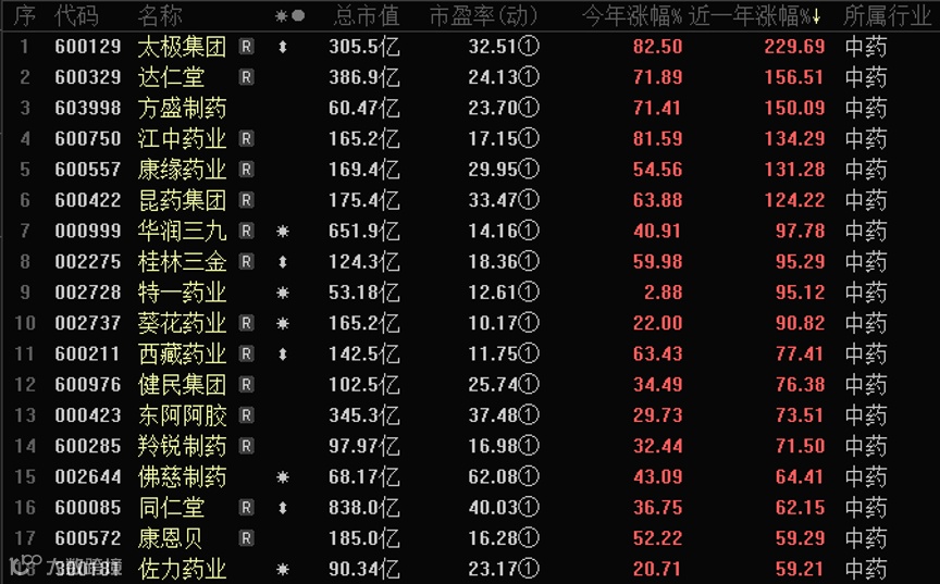 近期,中药概念股频频走强,达仁堂、同仁堂、华润三九、太极集团、江中药业等个股近日创出历史新高,其中太极集团、达仁堂、江中药业等较近一年股价翻倍。