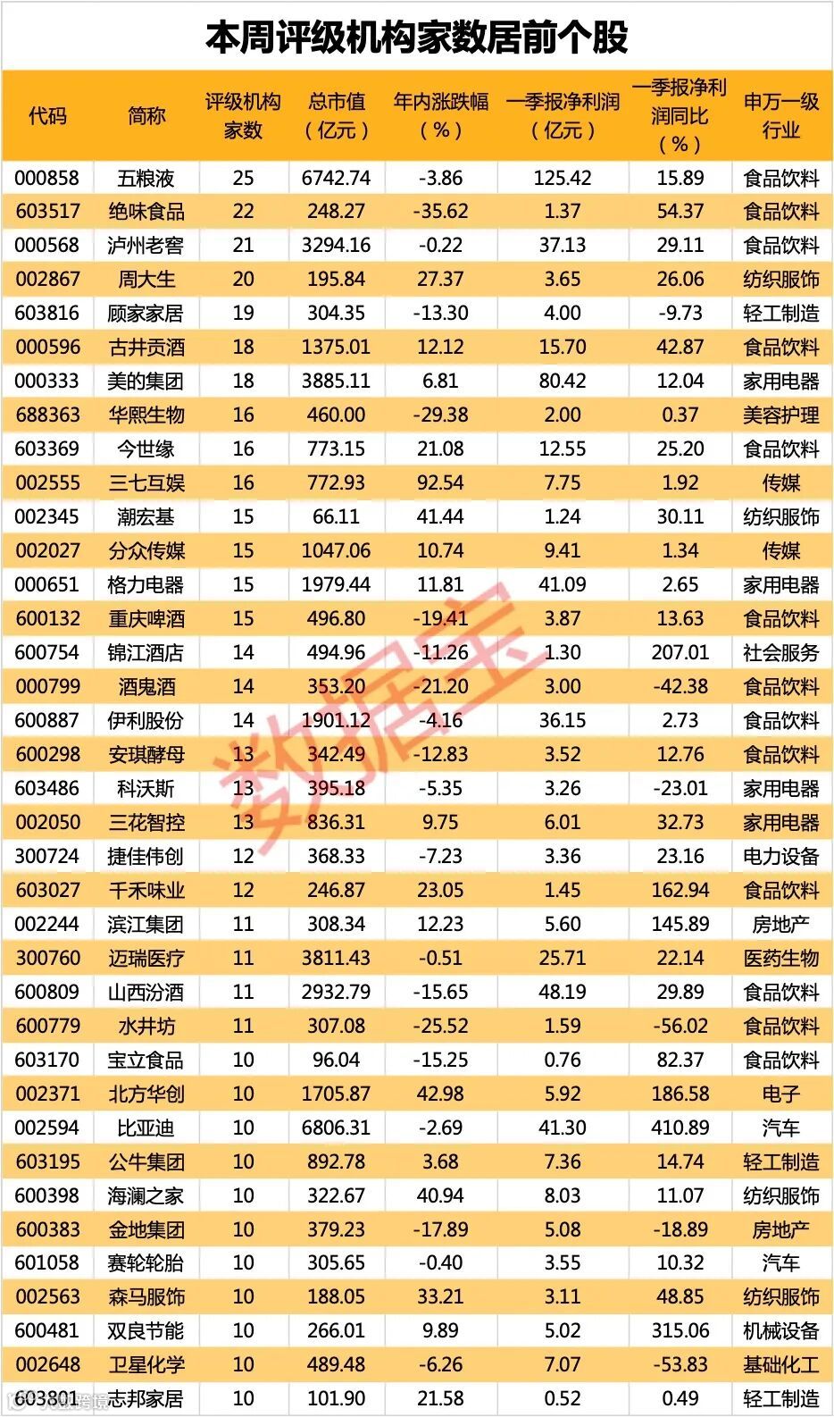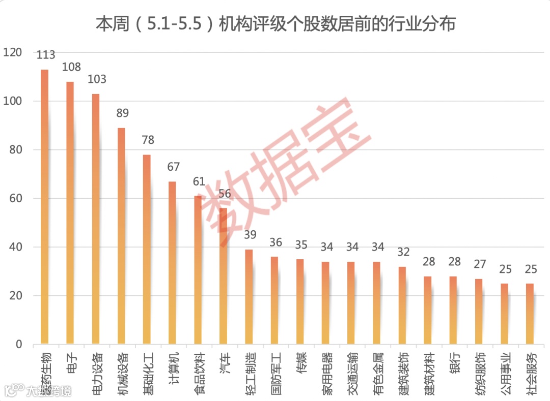 从申万一级行业来看,医药生物行业中,113股获机构评级;电子行业和电力设备行业分别有108股和103股获评级;机械设备、基础化工和计算机等行业获评级个股均超20只。