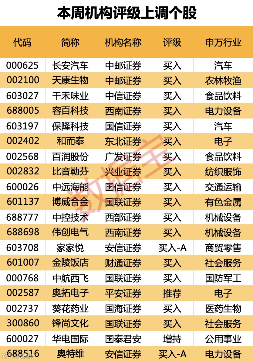 数据宝统计,机构本周上调20股的评级。长安汽车、天康生物获中邮证券上调至“买入”评级;比音勒芬获兴业证券上调至“买入”评级;奥拓电子获平安证券上调至“推荐”评级;华电国际获国泰君安上调至“增持”。