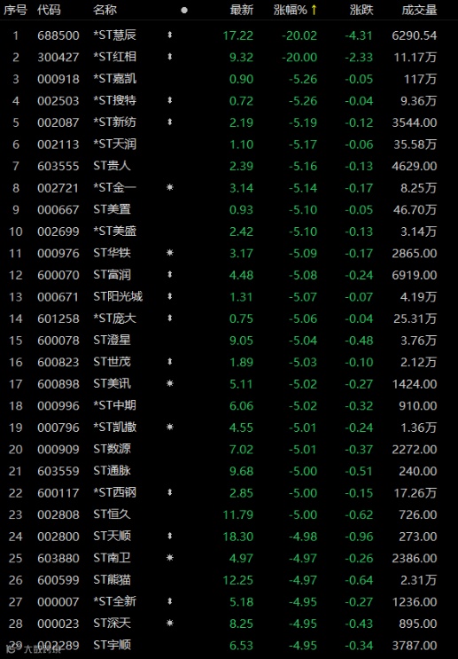 5月5日,多家公司发布2022年年报后被实施退市风险警示和其他风险警示公告,*ST慧辰、*ST红相双双20cm跌停,包括*ST嘉凯、*ST搜特、*ST新纺、ST贵人等合计超40只成份股封跌停。